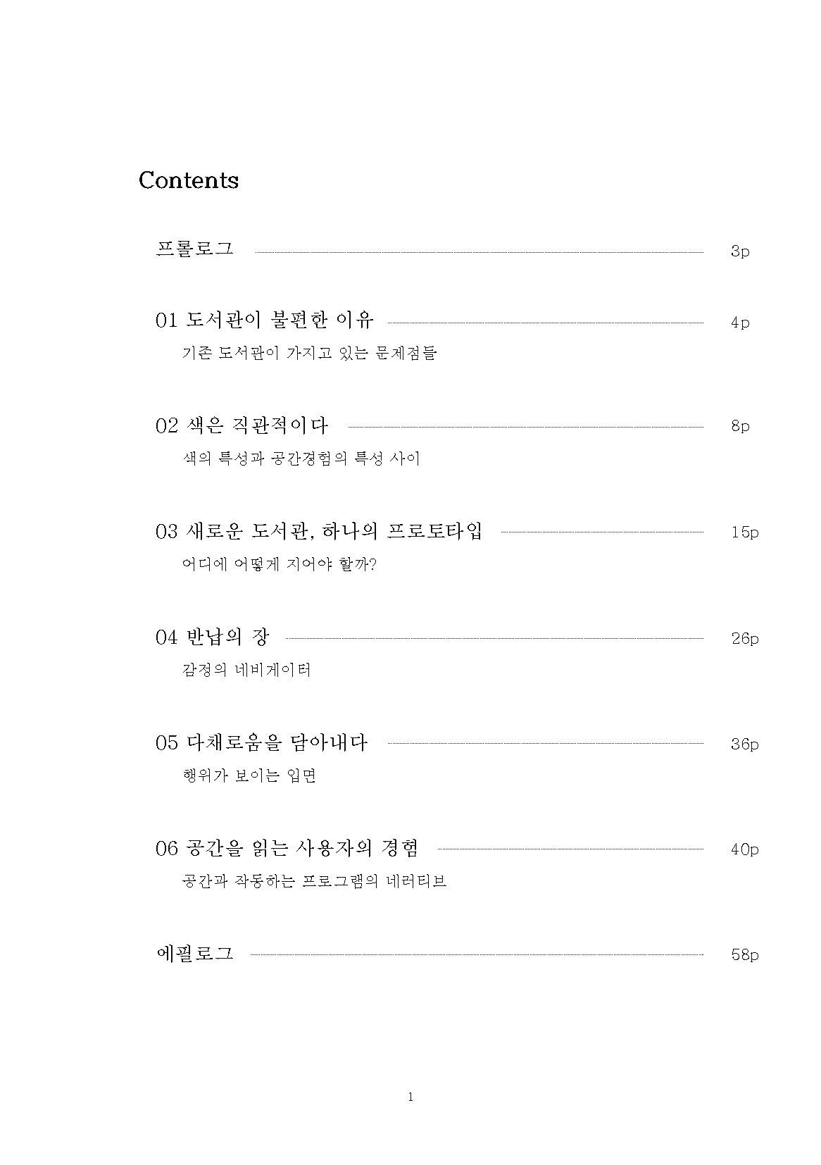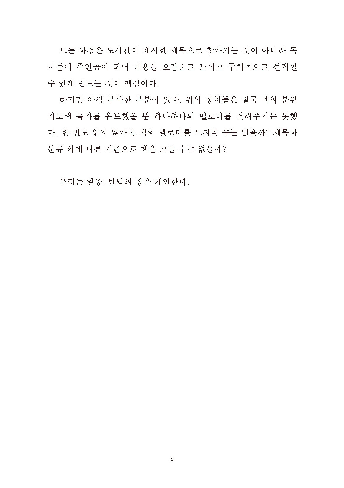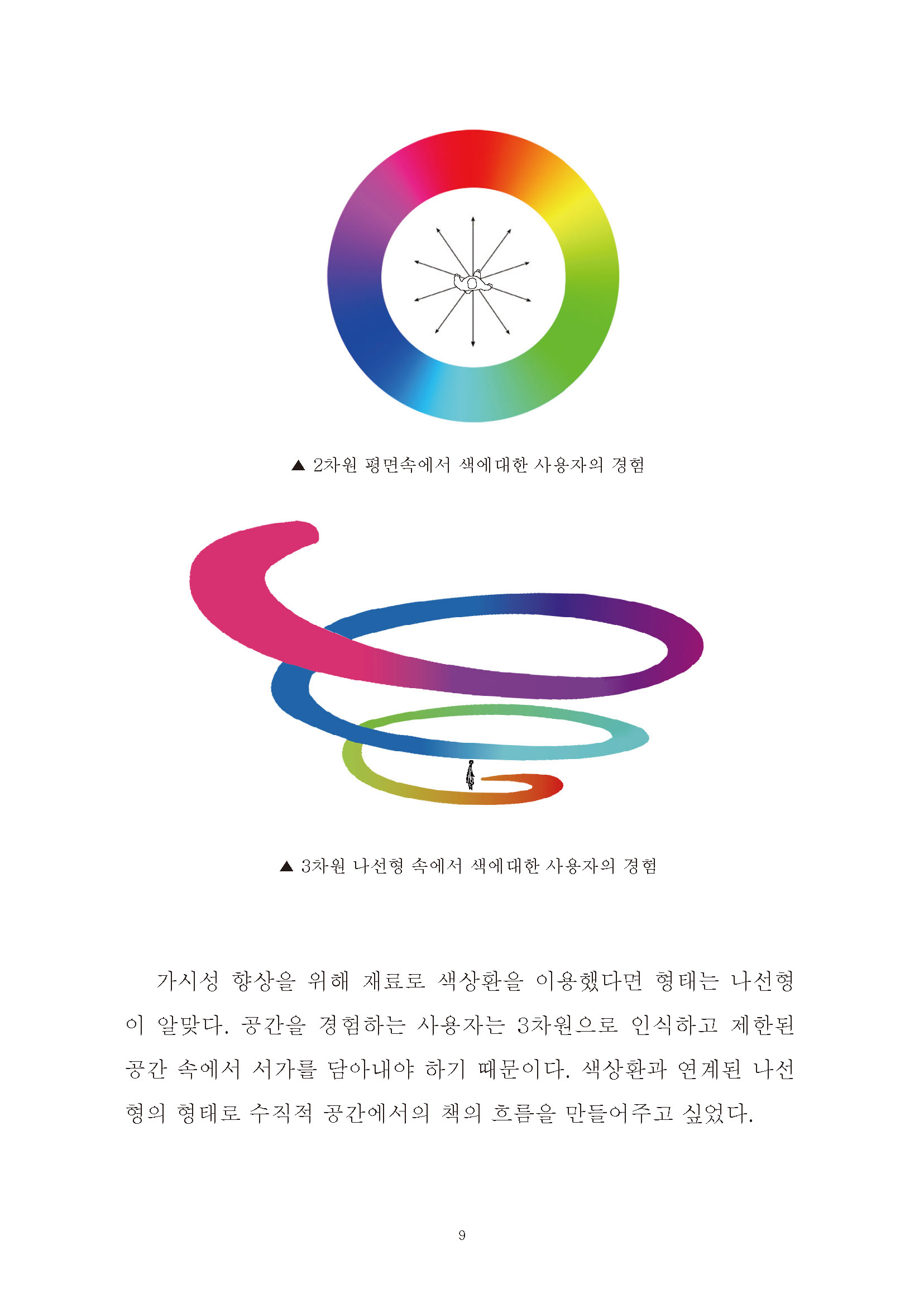 전형적인 서가 배치인 <듀이 10진 분류법>에 의문을 품고, 경계가 뚜렷하지 않은 서가 배치에서 출발했다. 우리의 목표는 도서관은 "연속적인 도서의 경험"을 제공해 주어야 하고, "책으로부터 다양한 활동들"이 파생되고자 했다. 경계를 가지지 않는 색을 대입해서 책을 분류하고, 각 분류에서 파생된 활동 공간을 배치하여 독서 그 이상으로 경험되길 바랐다.